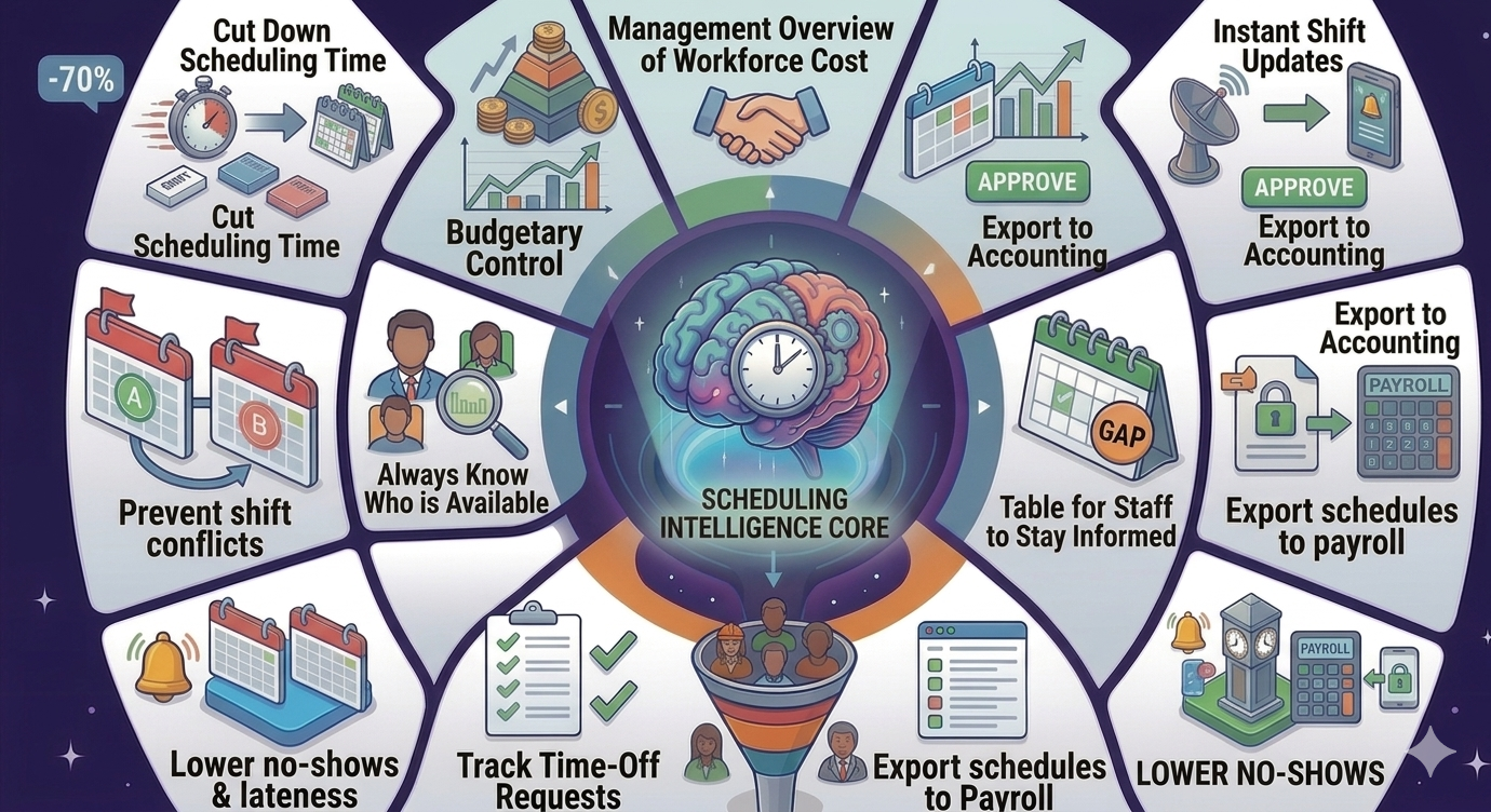 Every week, a manager spends countless hours creating shifts. For each shift, about 15 minutes is lost between coordinating availability, handling requests, and making sure everyone is covered.